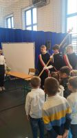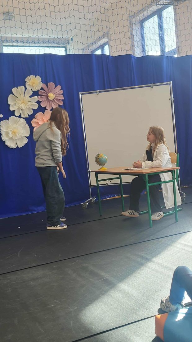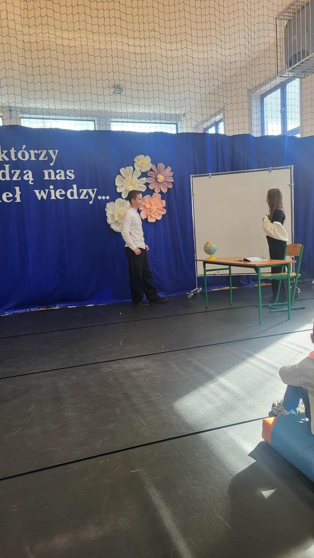W dniu 13 października w naszej szkole odbyła się uroczysta akademia z okazji Dnia Edukacji Narodowej. Gospodarzami wydarzenia były klasy 6a i 6b. Podczas tego wyjątkowego spotkania obecni byli emerytowani nauczyciele, pracownicy szkoły oraz przedstawiciele Rady Rodziców. Uczniowie klas szóstych złożyli nauczycielom serdeczne życzenia, a następnie zaprezentowali skecz pt. „Jeden dzień z życia ucznia”, który wywołał wiele uśmiechów na twarzach zebranych gości. Cała publiczność aktywnie włączyła się w przedstawienie, tworząc radosną i pełną energii atmosferę. Po występie głos zabrała przewodnicząca szkoły, która w imieniu uczniów podziękowała nauczycielom za trud, cierpliwość i poświęcenie. Następnie przemówiła Pani Dyrektor, dziękując całej społeczności szkolnej za wspólną pracę i zaangażowanie w rozwój uczniów. Na zakończenie kilka słów uznania przekazali również przedstawiciele Rady Rodziców, wyrażając wdzięczność za codzienny wysiłek pedagogów. Był to dzień pełen ciepła, uśmiechów i wzruszeń. Dziękujemy wszystkim, którzy przyczynili się do organizacji tej uroczystości.