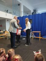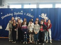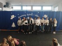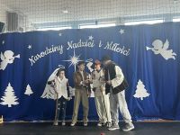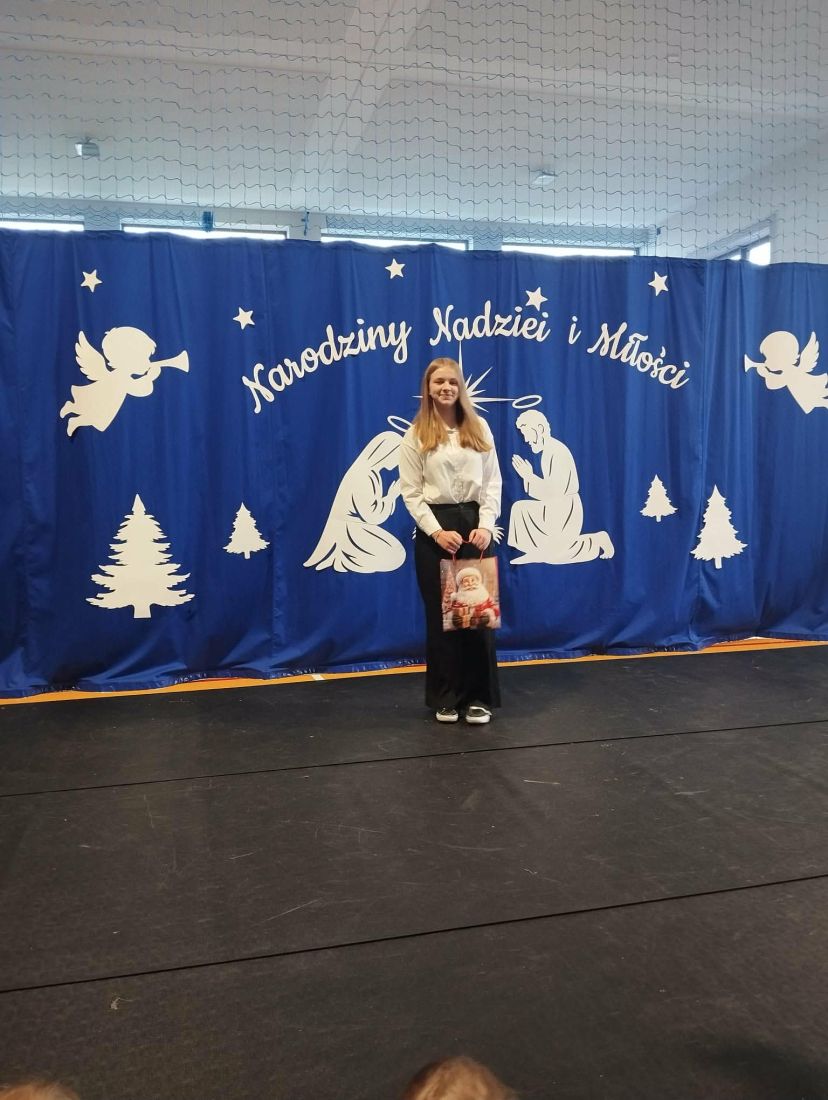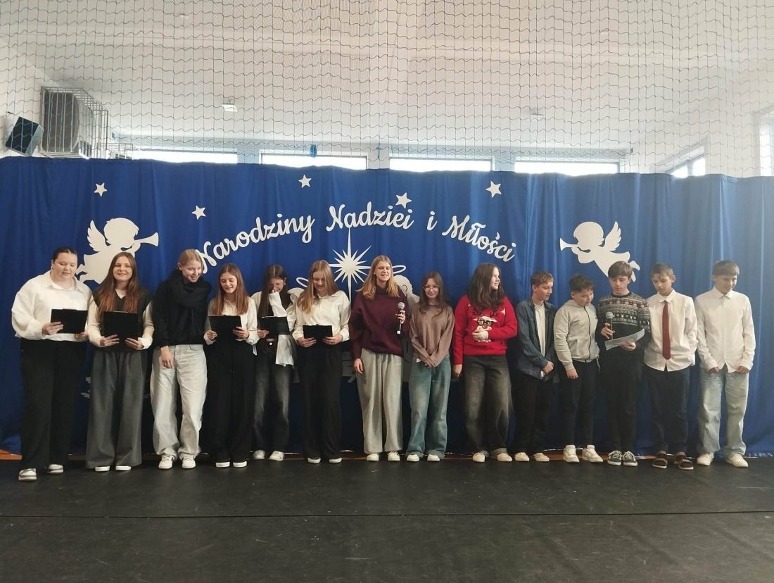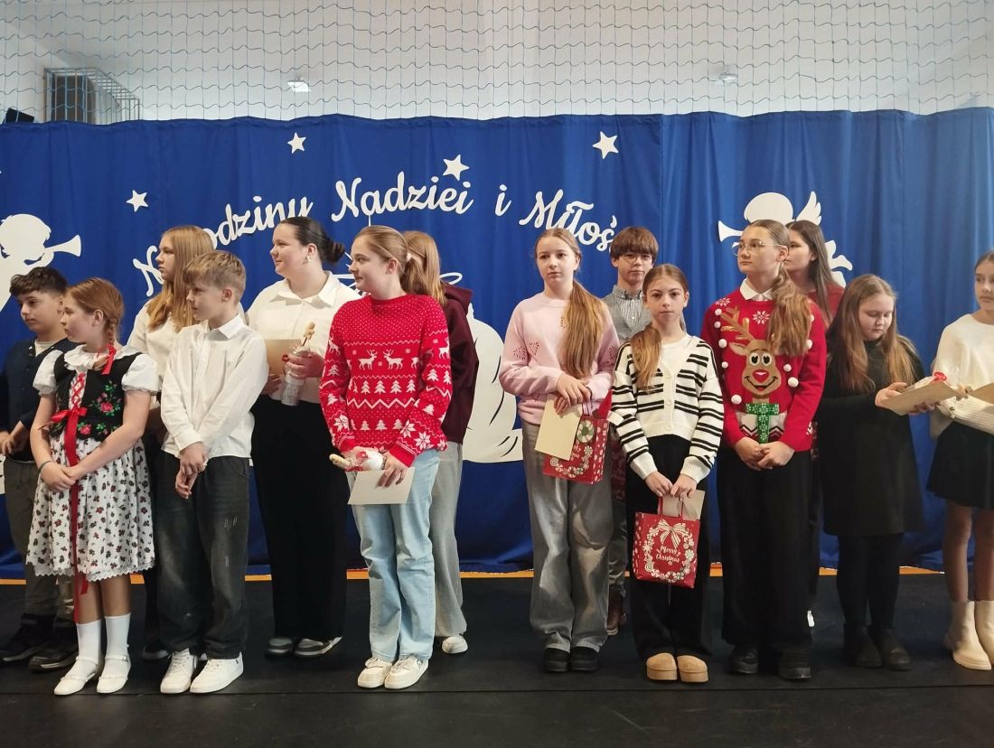 Po zakończeniu jasełek odbyło się uroczyste wręczenie nagród w szkolnych konkursach świątecznych 🎁. Nagrodzono autorów najpiękniejszych kartek świątecznych ✉️ oraz twórców najciekawszych i najbardziej pomysłowych ozdób bożonarodzeniowych ⭐. Konkursy cieszyły się dużym zainteresowaniem uczniów, a zaprezentowane prace wyróżniały się kreatywnością, estetyką i starannością wykonania 🎨.