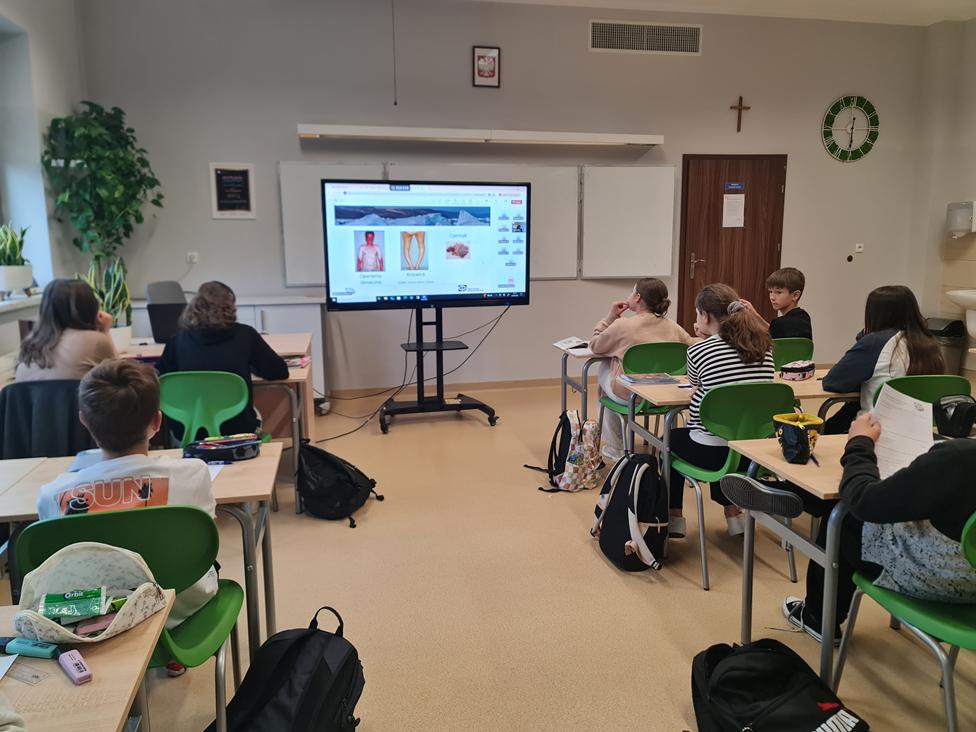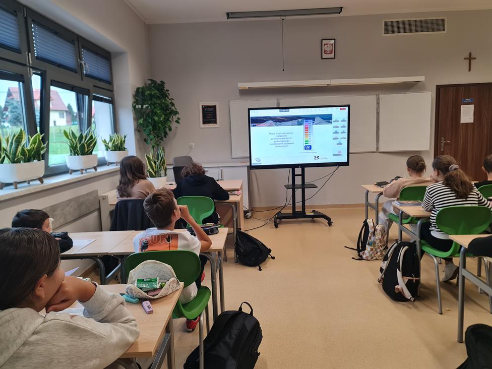 W środę, 24 września, uczniowie klasy 7 wzięli udział w interesującej lekcji online, zorganizowanej przez Instytut Geofizyki PAN. Spotkanie poświęcone było tematowi „Promieniowanie UV a bezpieczne opalanie”. Podczas zajęć uczniowie odkryli, dlaczego słońce może stanowić zagrożenie dla zdrowia. Prowadząca w ciekawy i prosty sposób przybliżyła pojęcie promieniowania UV oraz jego skutki dla zdrowia człowieka. Najważniejszym elementem lekcji było poznanie zasad profilaktyki, które pomagają korzystać z promieni słonecznych w sposób bezpieczny i odpowiedzialny.