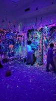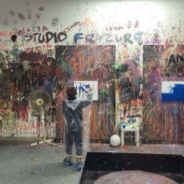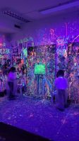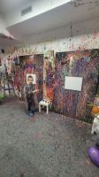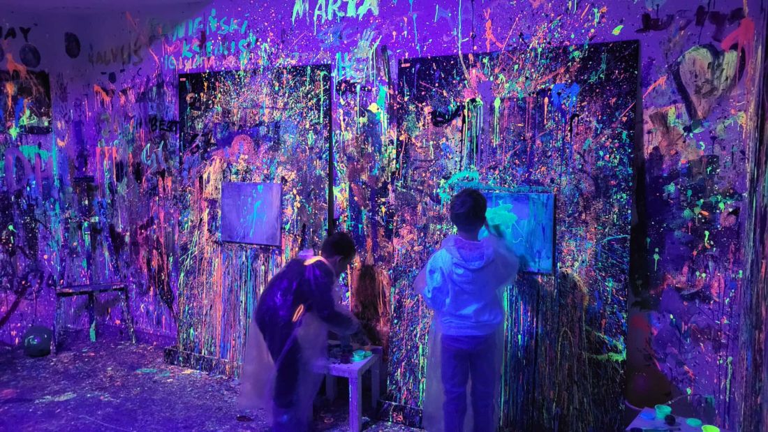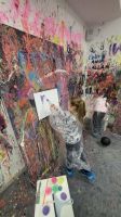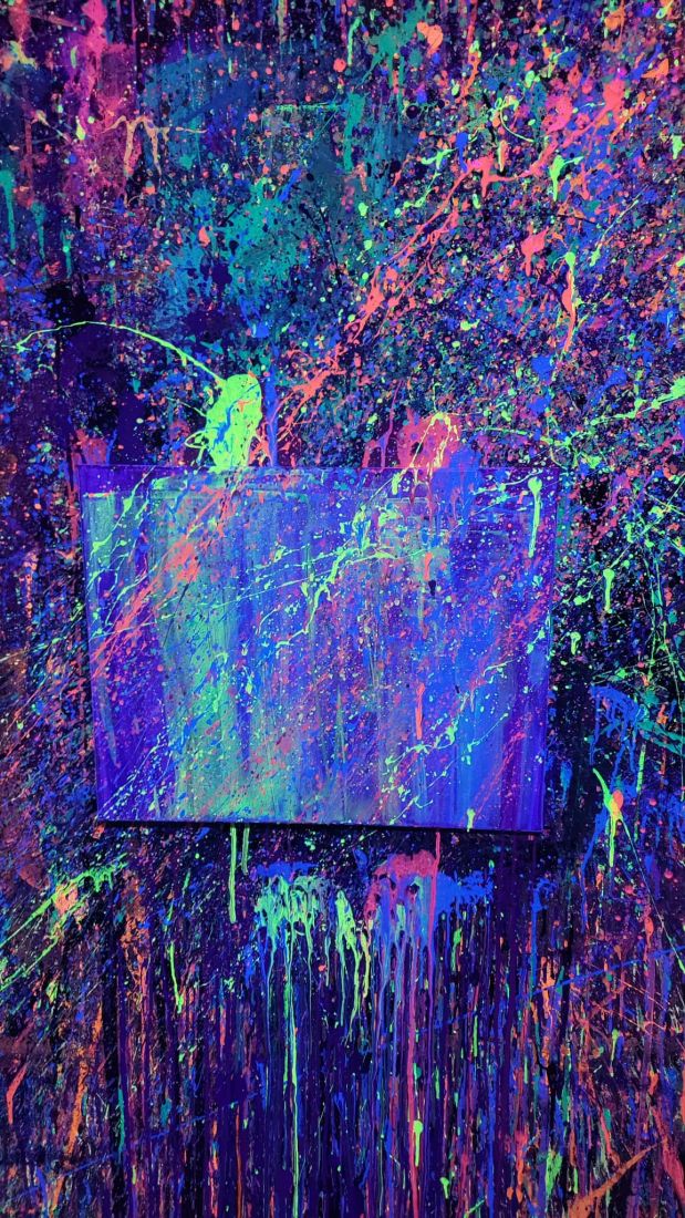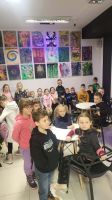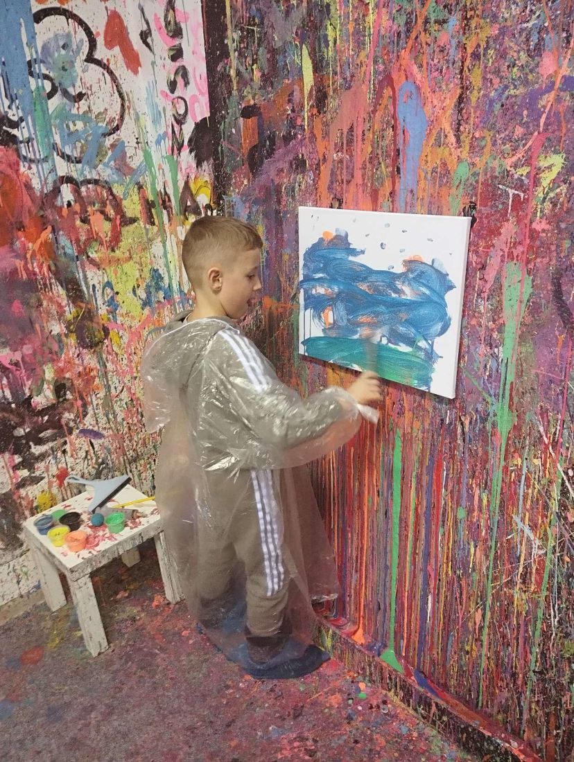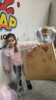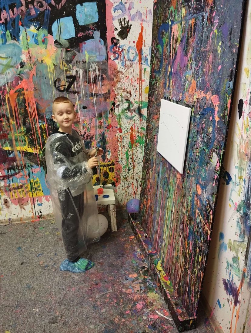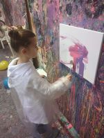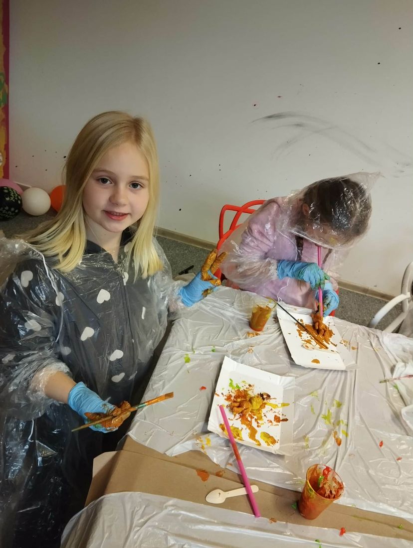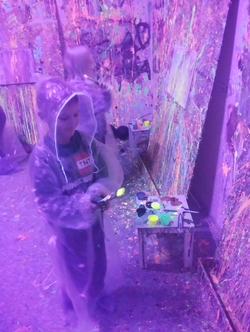 Pierwszaki rozpoczęły zajęcia od malowania obrazów techniką swobodnego „chlapania” farbą. Dużo radości dostarczyło im tworzenie zarówno farbami tradycyjnymi, jak i tymi, które efektownie świecą w świetle UV. Dzięki temu powstały wyjątkowe, dynamiczne prace.