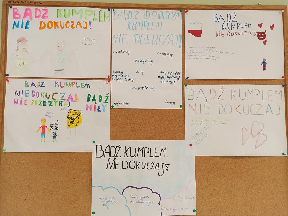 W klasie siódmej na godzinach wychowawczych wykorzystano filmiki edukacyjne z Cartoon Network pt. „Nie dokuczaj”. Uczniowie włączyli się również do akcji promującej „Szkołę bez przemocy”. Na zakończenie wykonali plakaty, które zostały wywieszone na tablicy w klasie, promując ideę życzliwości i wzajemnego szacunku.