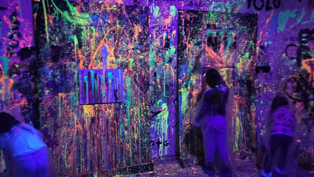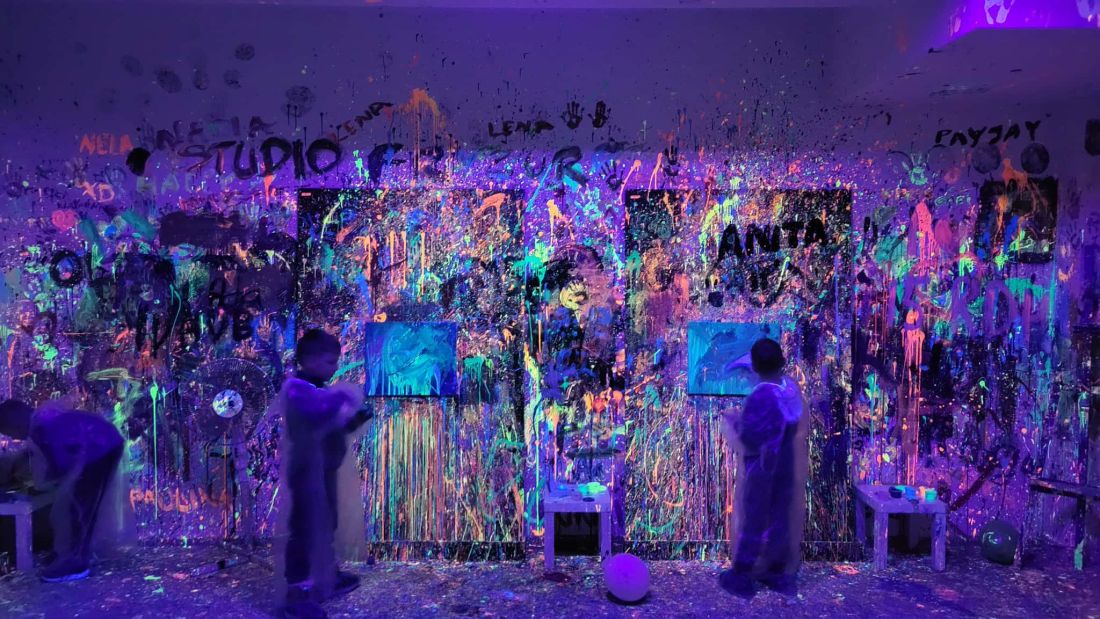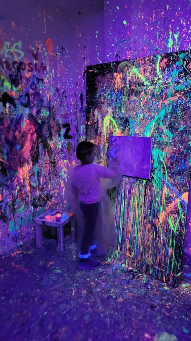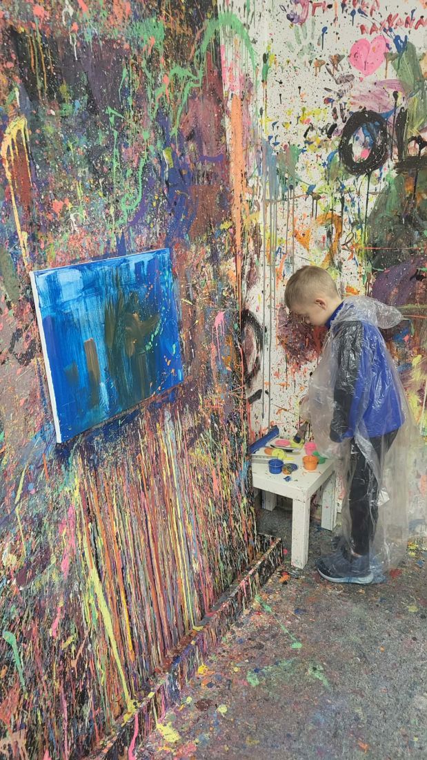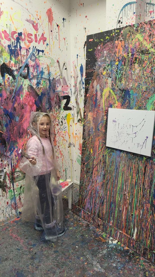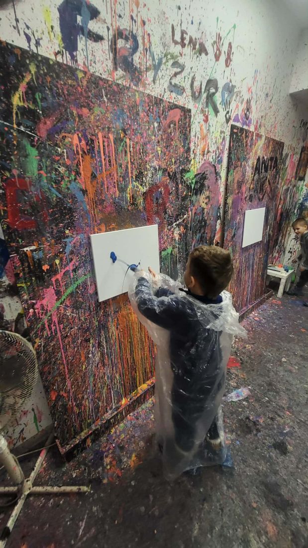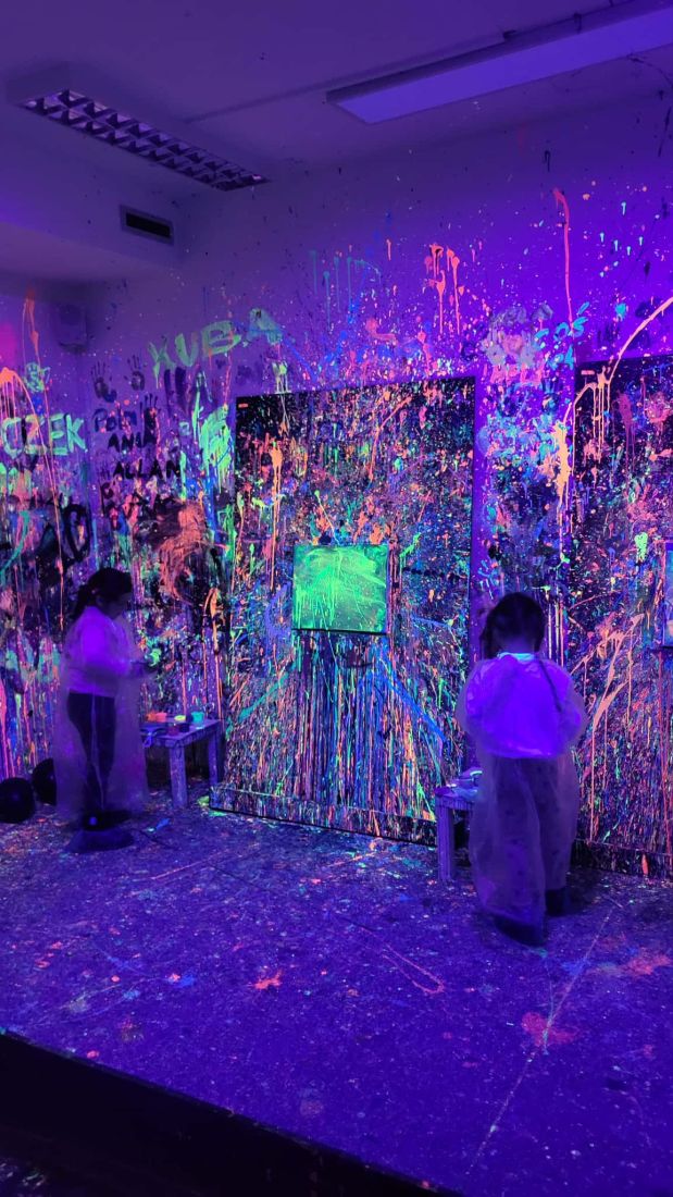 Pierwszaki rozpoczęły zajęcia od malowania obrazów techniką swobodnego „chlapania” farbą. Dużo radości dostarczyło im tworzenie zarówno farbami tradycyjnymi, jak i tymi, które efektownie świecą w świetle UV. Dzięki temu powstały wyjątkowe, dynamiczne prace.