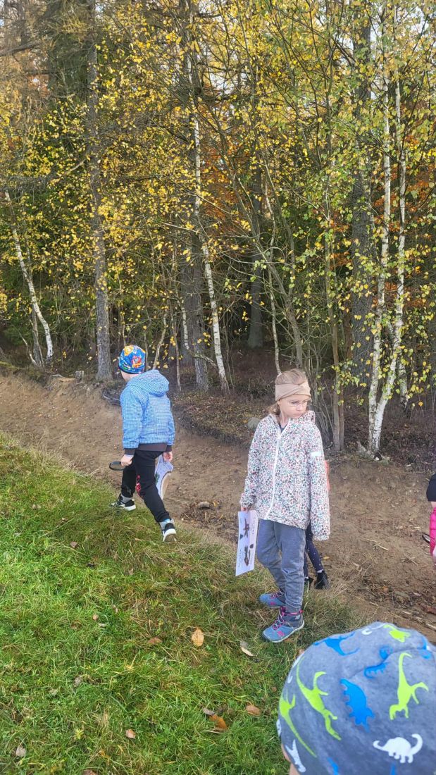 Dzieci rozpoznawały gatunki drzew, obserwowały zmiany zachodzące w przyrodzie oraz poszukiwały leśnych skarbów – kolorowych liści, szyszek i mchu. 🌿
