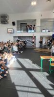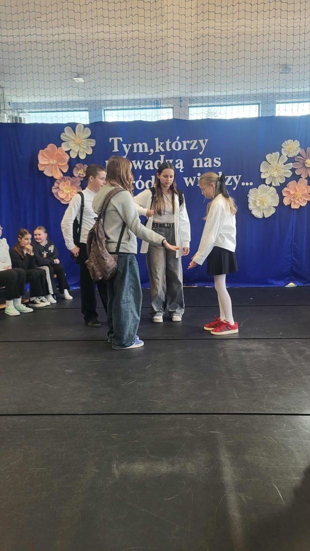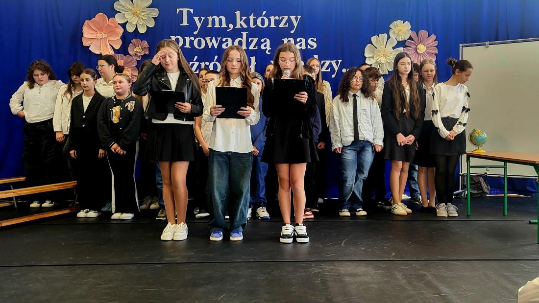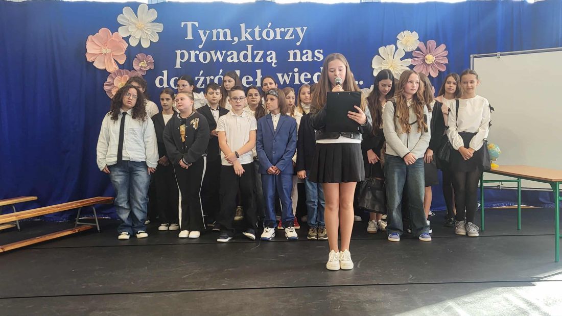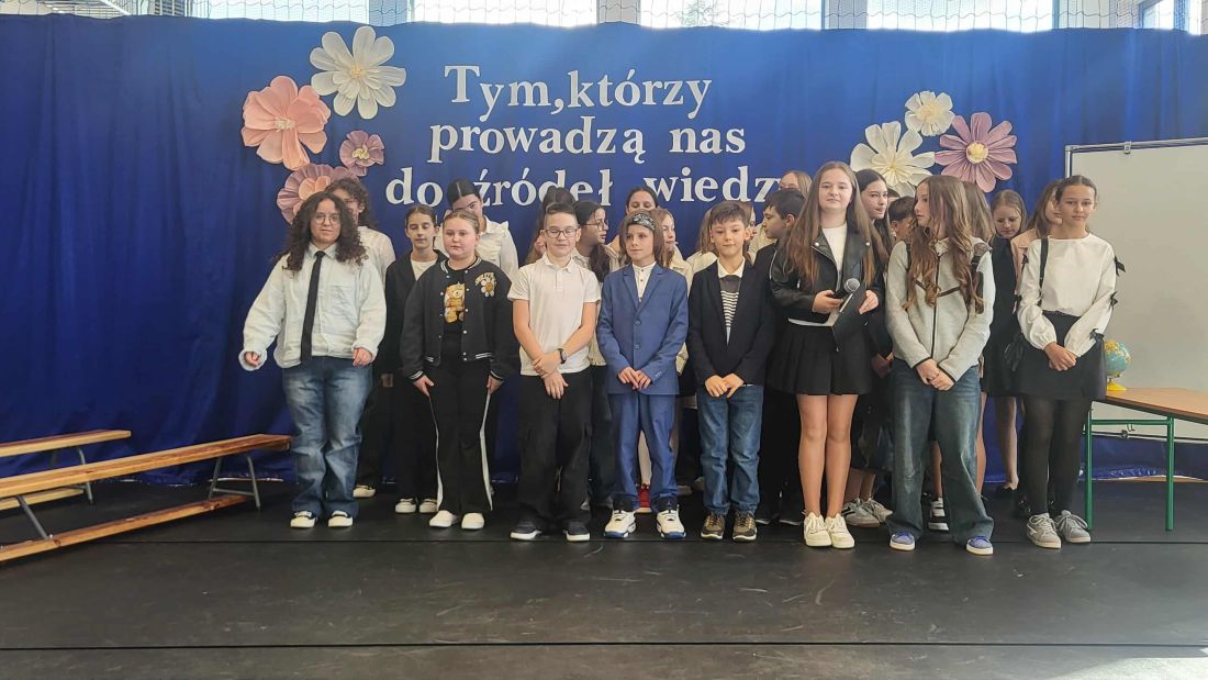 W dniu 13 października w naszej szkole odbyła się uroczysta akademia z okazji Dnia Edukacji Narodowej. Gospodarzami wydarzenia były klasy 6a i 6b. Podczas tego wyjątkowego spotkania obecni byli emerytowani nauczyciele, pracownicy szkoły oraz przedstawiciele Rady Rodziców. Uczniowie klas szóstych złożyli nauczycielom serdeczne życzenia, a następnie zaprezentowali skecz pt. „Jeden dzień z życia ucznia”, który wywołał wiele uśmiechów na twarzach zebranych gości. Cała publiczność aktywnie włączyła się w przedstawienie, tworząc radosną i pełną energii atmosferę. Po występie głos zabrała przewodnicząca szkoły, która w imieniu uczniów podziękowała nauczycielom za trud, cierpliwość i poświęcenie. Następnie przemówiła Pani Dyrektor, dziękując całej społeczności szkolnej za wspólną pracę i zaangażowanie w rozwój uczniów. Na zakończenie kilka słów uznania przekazali również przedstawiciele Rady Rodziców, wyrażając wdzięczność za codzienny wysiłek pedagogów. Był to dzień pełen ciepła, uśmiechów i wzruszeń. Dziękujemy wszystkim, którzy przyczynili się do organizacji tej uroczystości.