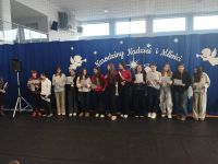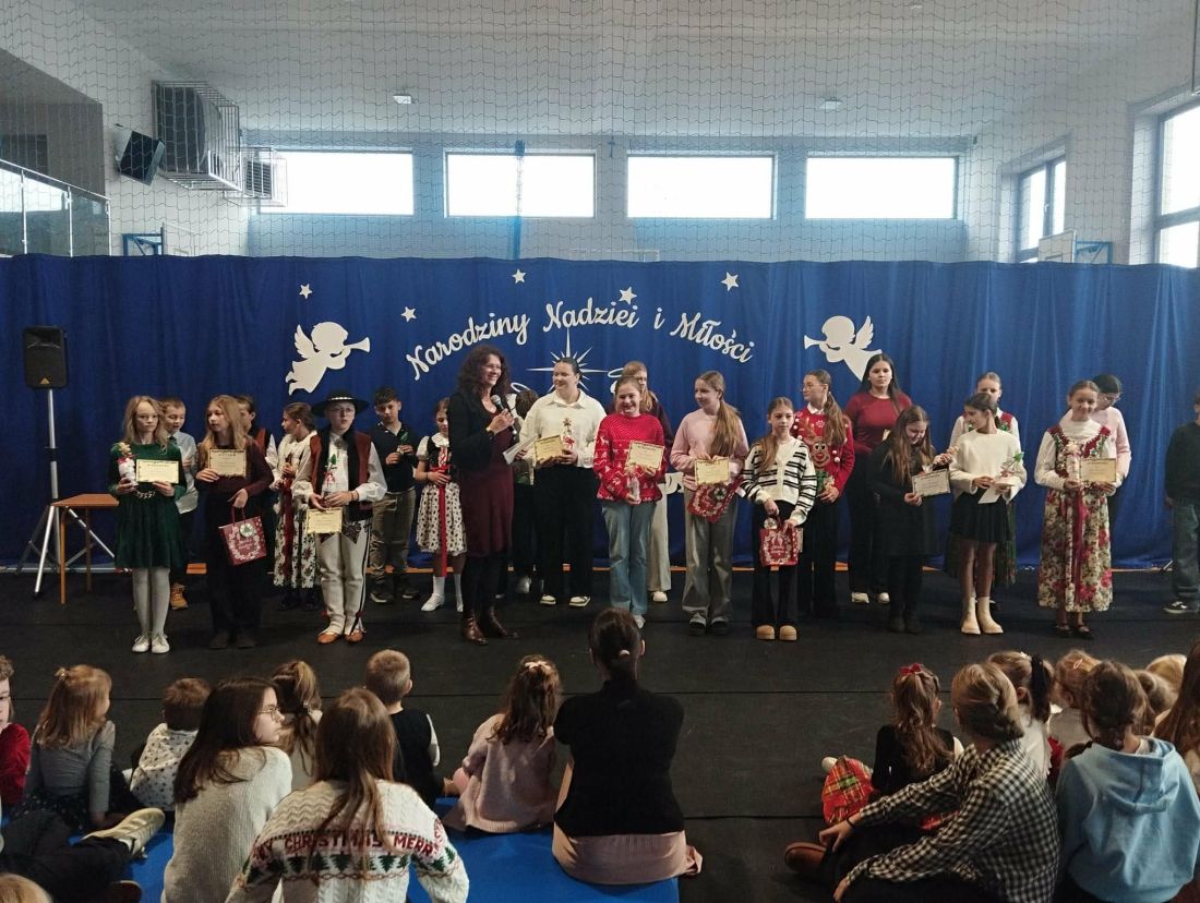 Po zakończeniu jasełek odbyło się uroczyste wręczenie nagród w szkolnych konkursach świątecznych 🎁. Nagrodzono autorów najpiękniejszych kartek świątecznych ✉️ oraz twórców najciekawszych i najbardziej pomysłowych ozdób bożonarodzeniowych ⭐. Konkursy cieszyły się dużym zainteresowaniem uczniów, a zaprezentowane prace wyróżniały się kreatywnością, estetyką i starannością wykonania 🎨.